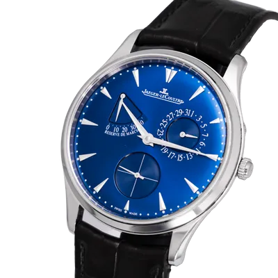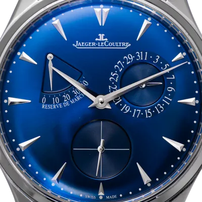 Master Ultra Thin Réserve de Marche 39 mm en acier, cadran bleu soleillé, bracelet en cuir, BD acier