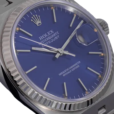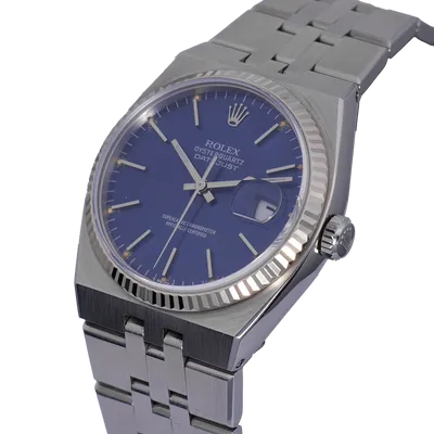Montre Rolex Oysterquartz 36mm en acier, cadran bleu, lunette cannelée, bracelet jubilé oysterquartz