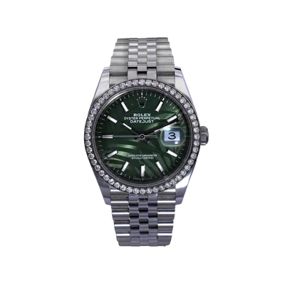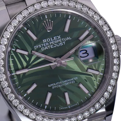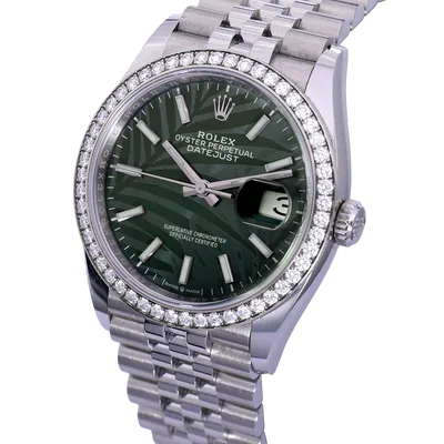 Oyster Perpetual Datejust 36mm en acier, lunette sertie, cadran vert Palm Motif, bracelet jubilé acier